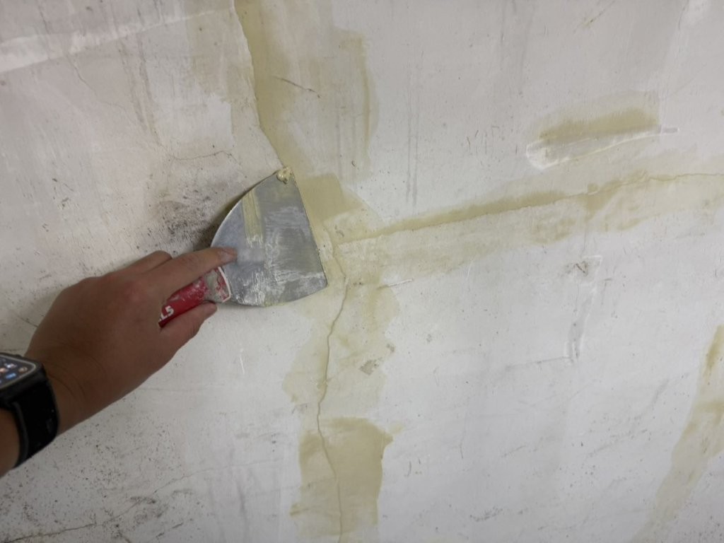 写真にもある通り、ひび割れ部分にはパテをしっかりと充填し、乾燥後に平滑になるようヘラで均します。