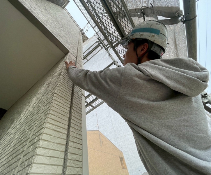 チョーキング(白い粉が手につく現象)、ひび割れ、苔やカビの付着、鉄部の錆などをチェックし、必要に応じて写真を撮影して報告します。