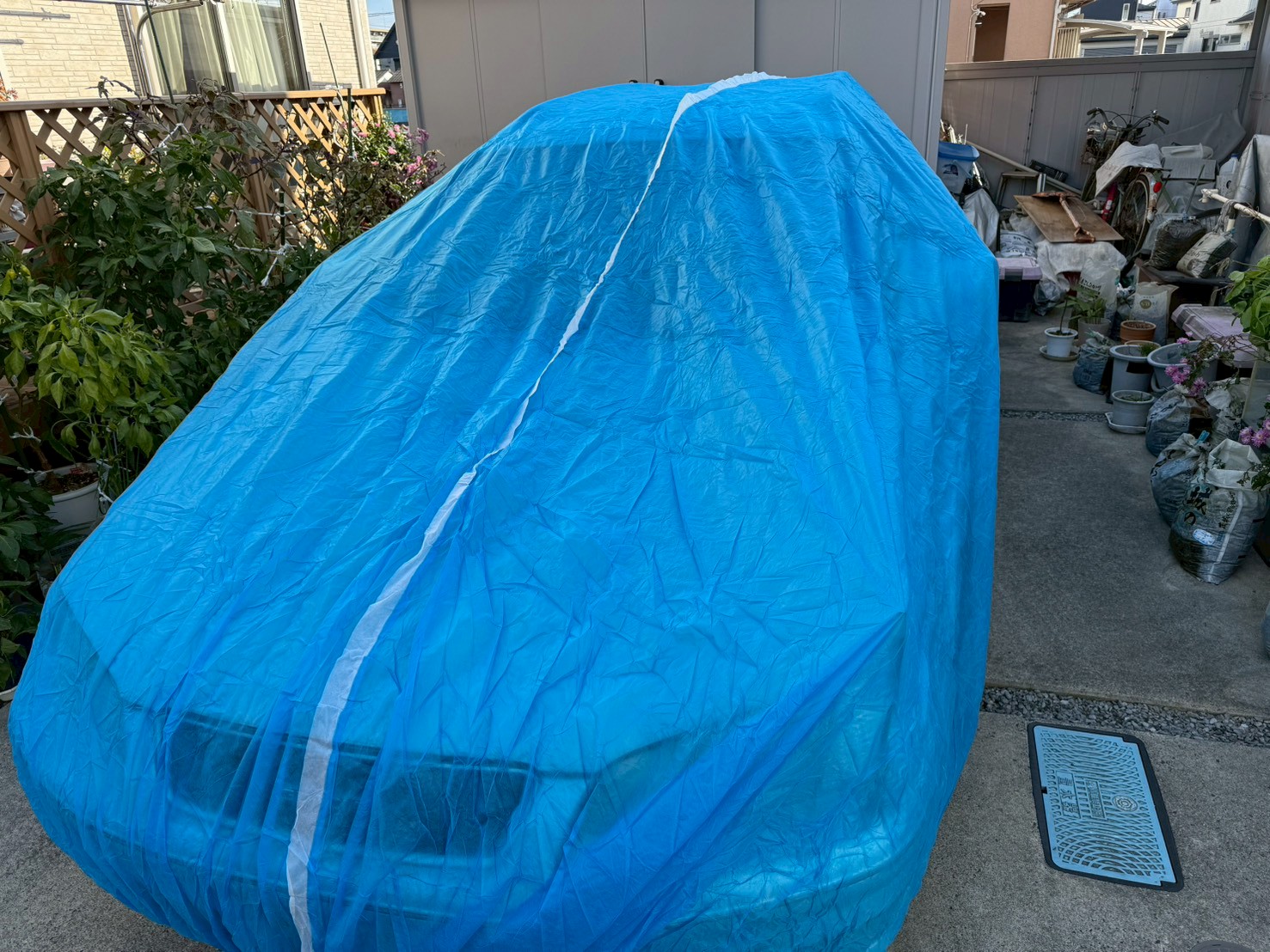 写真からも、車両全体を覆うように養生シートを掛け、ボディラインに沿って隙間なく固定している様子が確認できます。