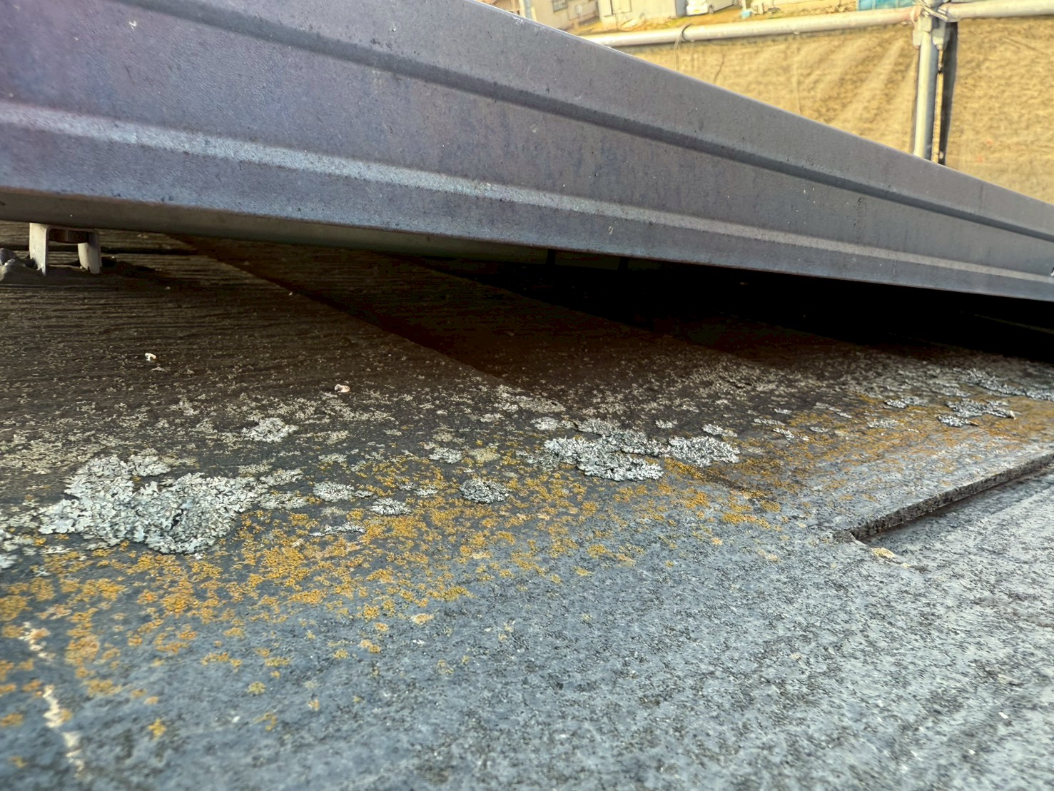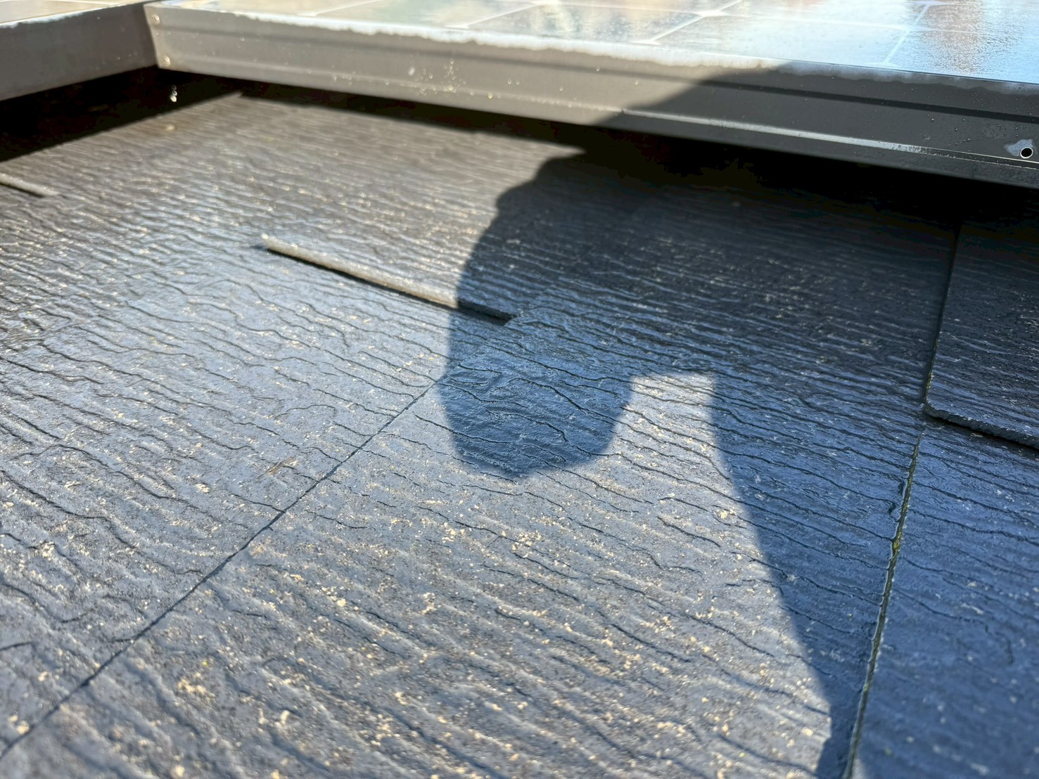 K様邸の屋根では、表面に付着した砂埃やコケ、藻類に加え、経年劣化によって弱くなった旧塗膜が確認できました。