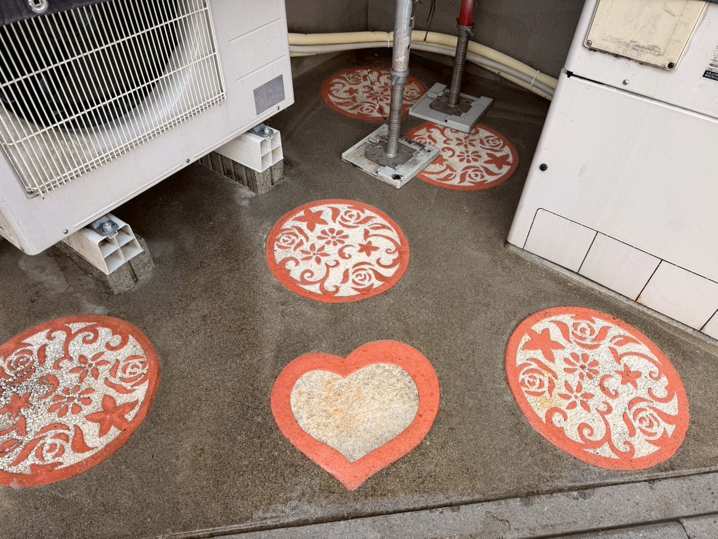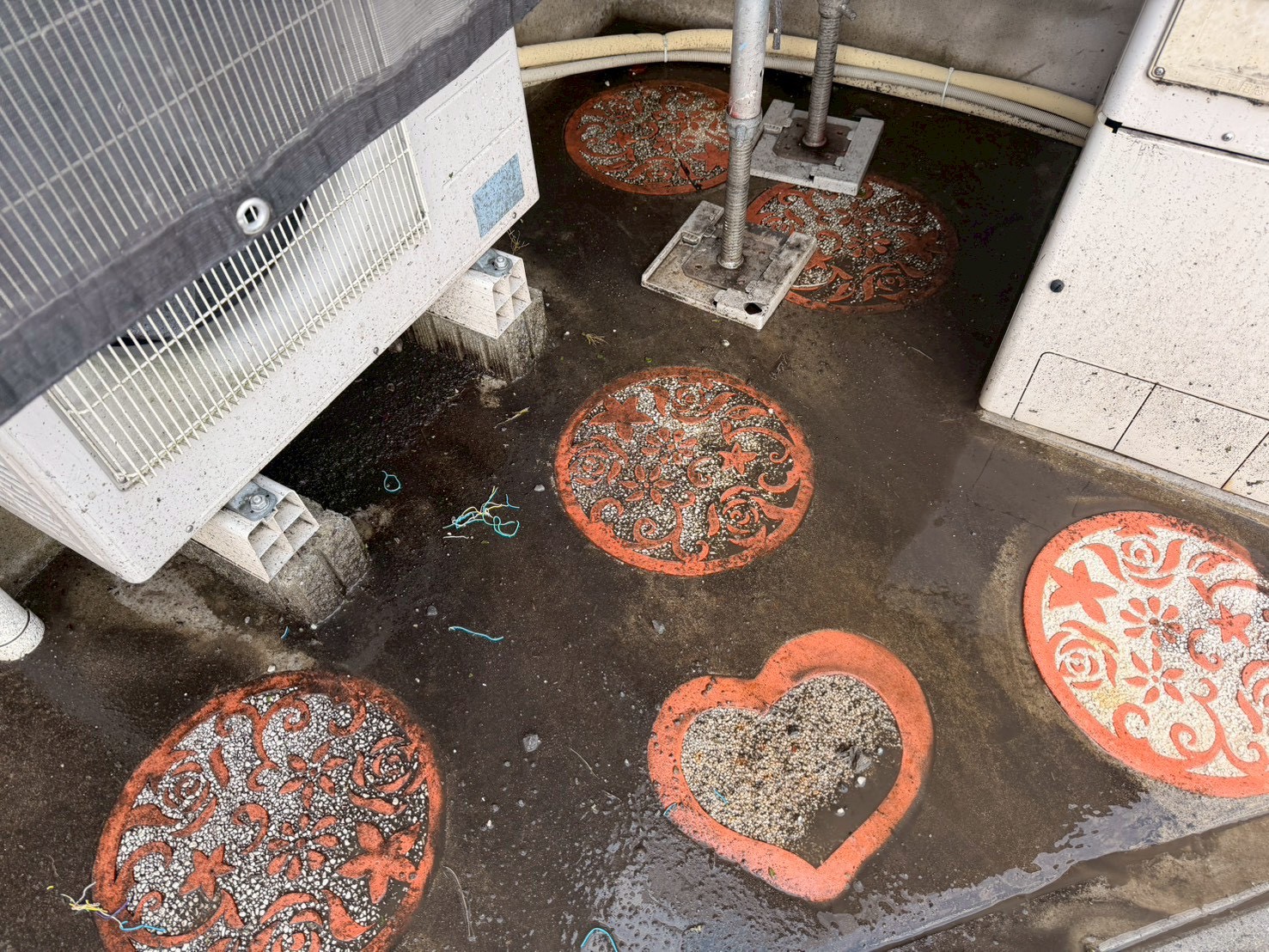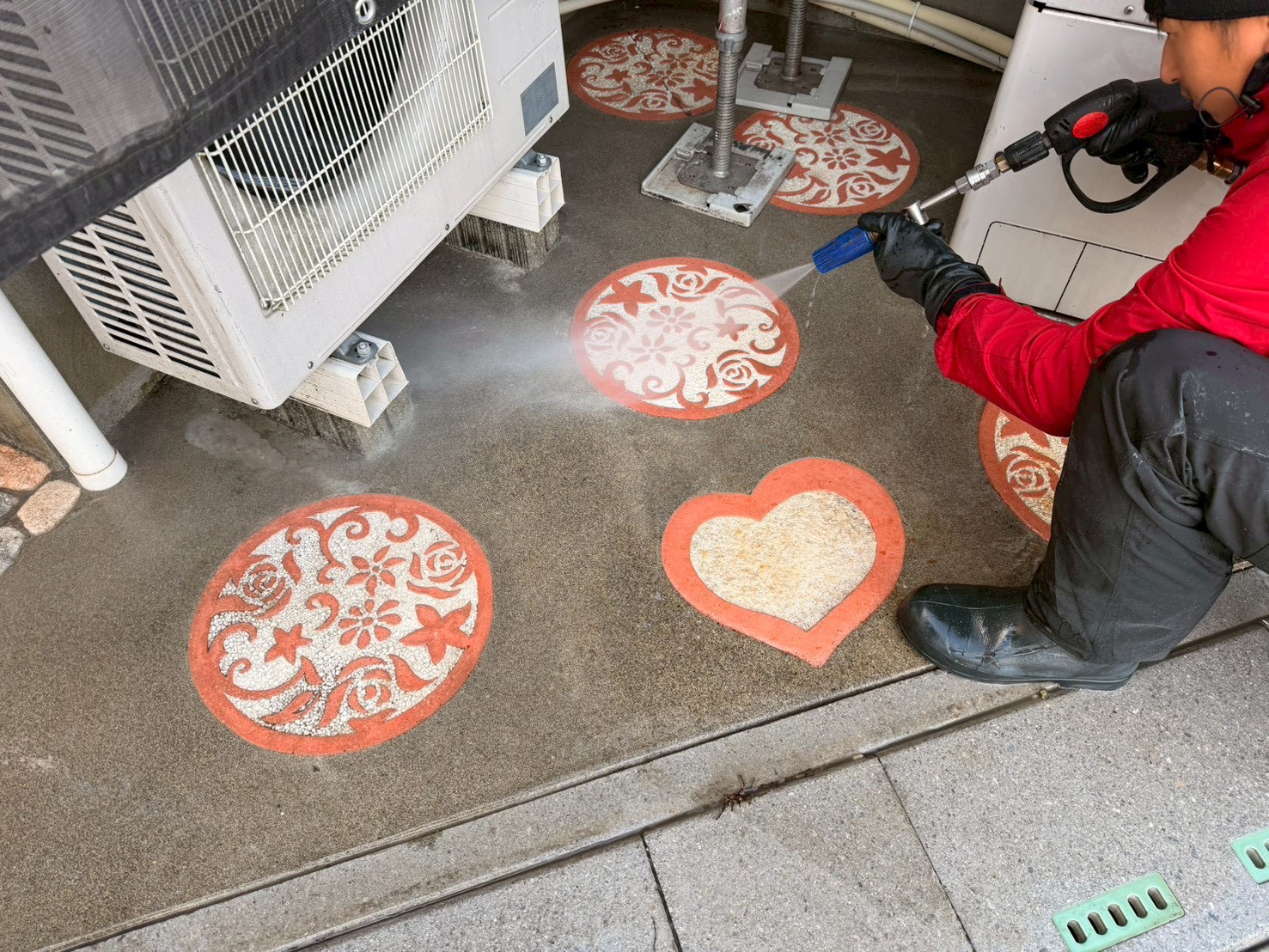 高圧洗浄を行うことで、模様部分の骨材がはっきりと現れ、コンクリート本来の色味と質感がよみがえっているのが写真からも分かります。