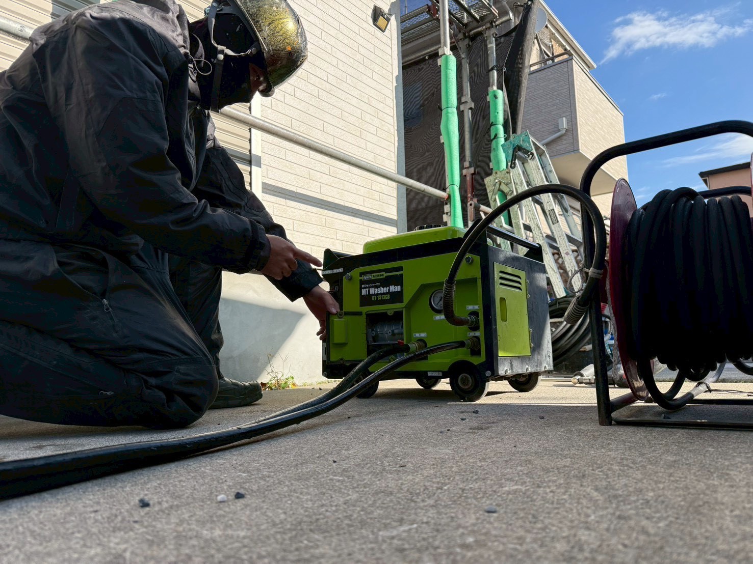高圧洗浄作業に入る前に、専用の高圧洗浄機を設置し、ホースや電源、水量・水圧の確認など入念な準備を行いました。
