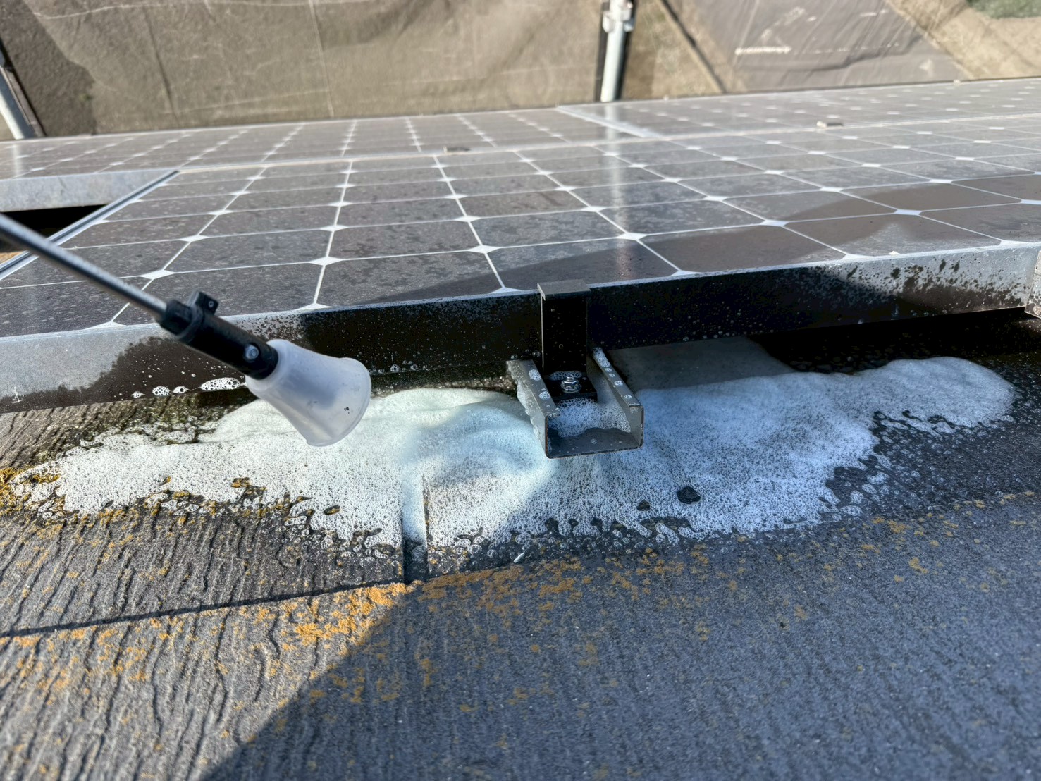 高圧洗浄では、屋根材の重なり部分や凹凸の奥まで水が行き渡るよう、噴射角度と距離を調整しながら作業を進めました。