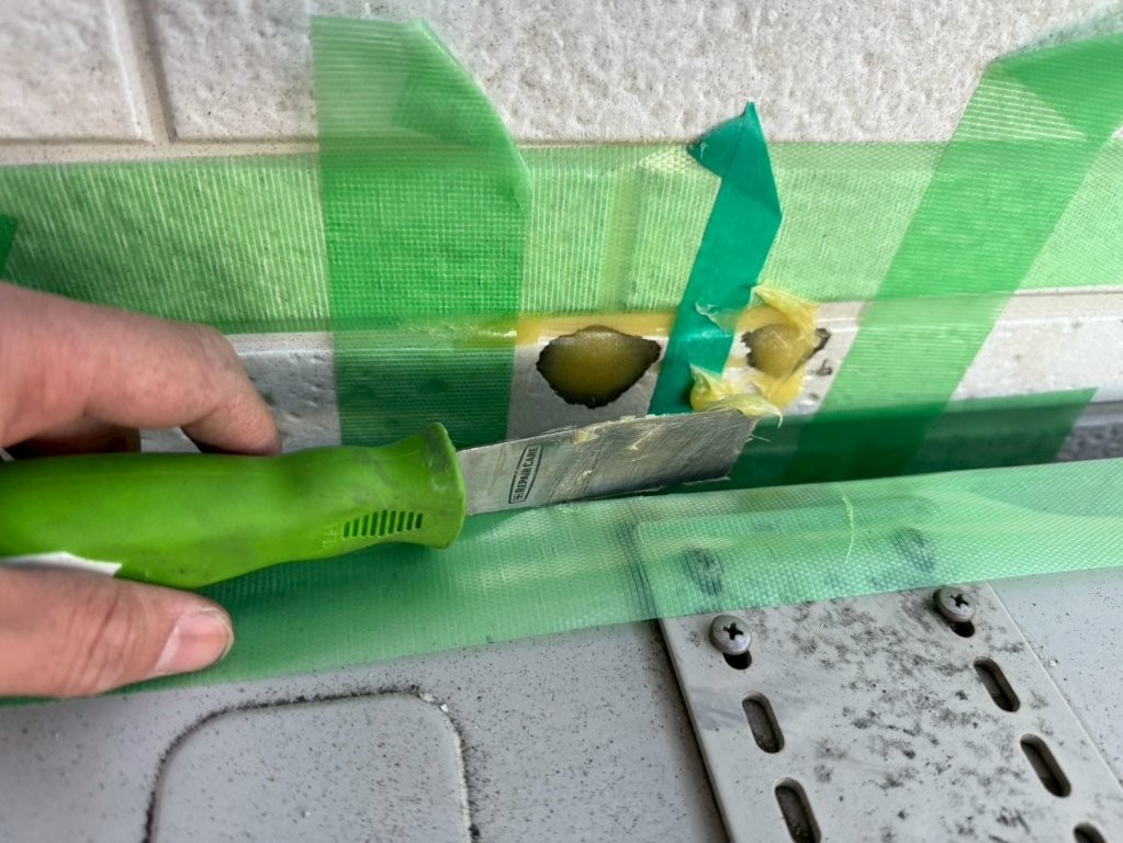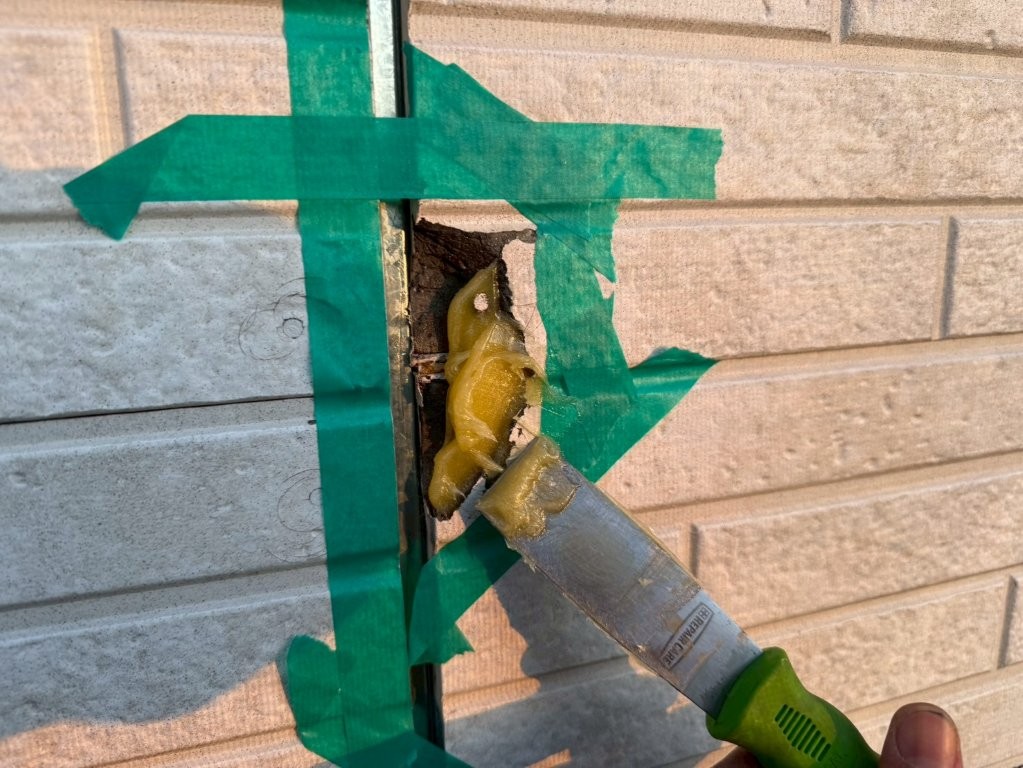 充填後はヘラで表面を成形し、既存のサイディングになじむよう整えました。