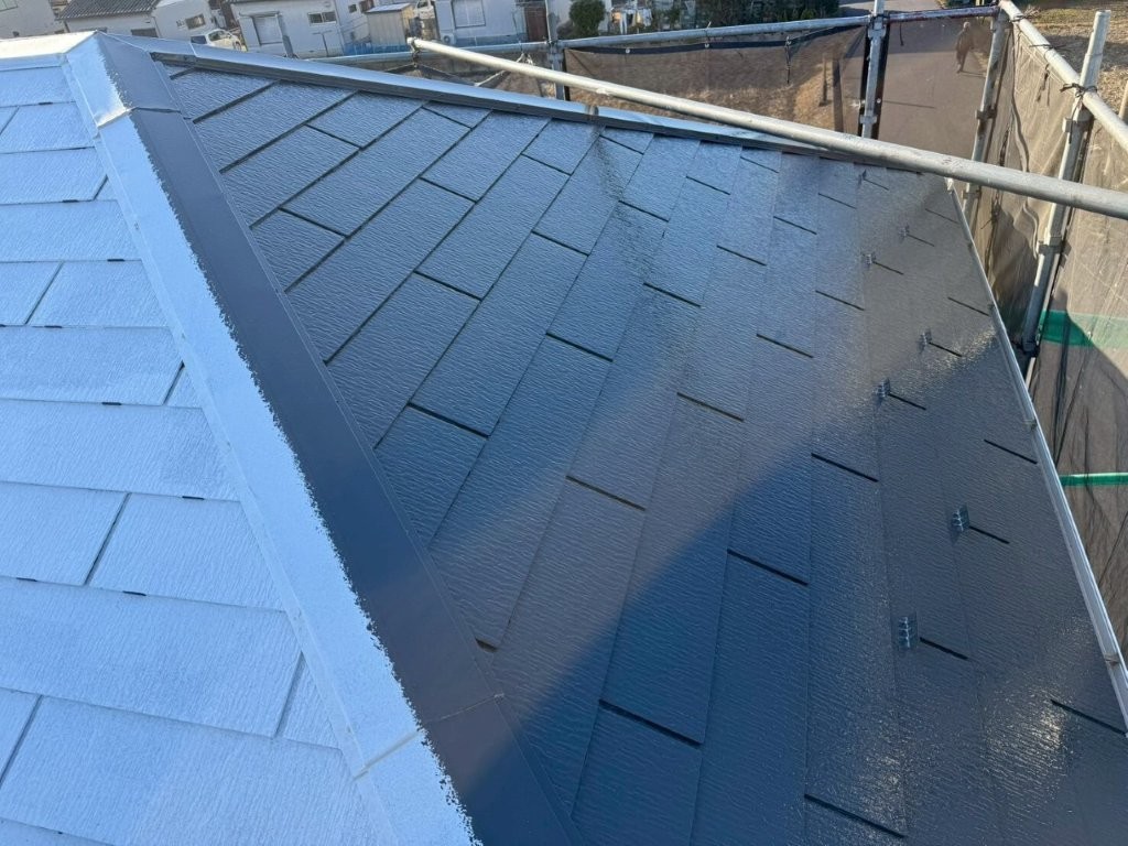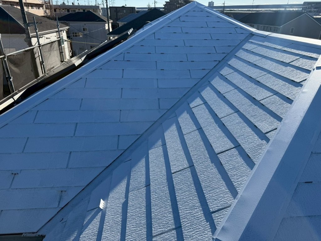 屋根全体が均一な色調で覆われ、上塗りを受けるために最適な塗膜状態が整っています。