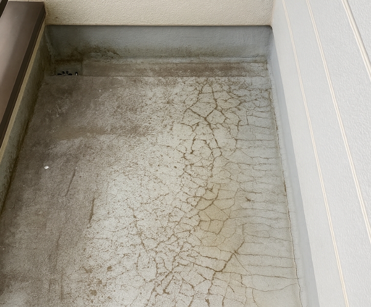 - ベランダ床全体にひび割れが発生し、防水機能が低下している状態