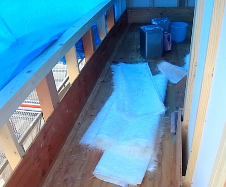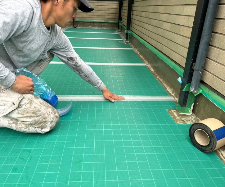 下地からの湿気や水分を逃がすため、通気緩衝シートを貼り付けます。このシートがあることで、内部の水分膨れを防止し、防水層の耐久性が大幅に向上します。排気ドレン(脱気筒)も設置し、湿気を外部に逃がす構造を作ります。