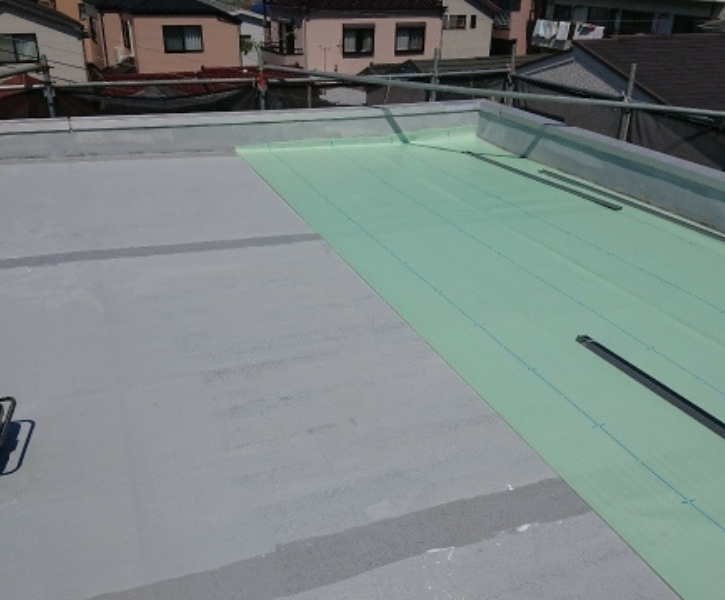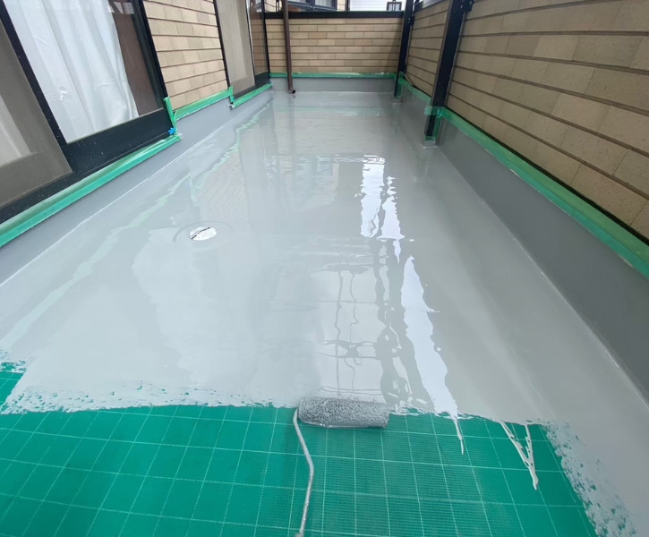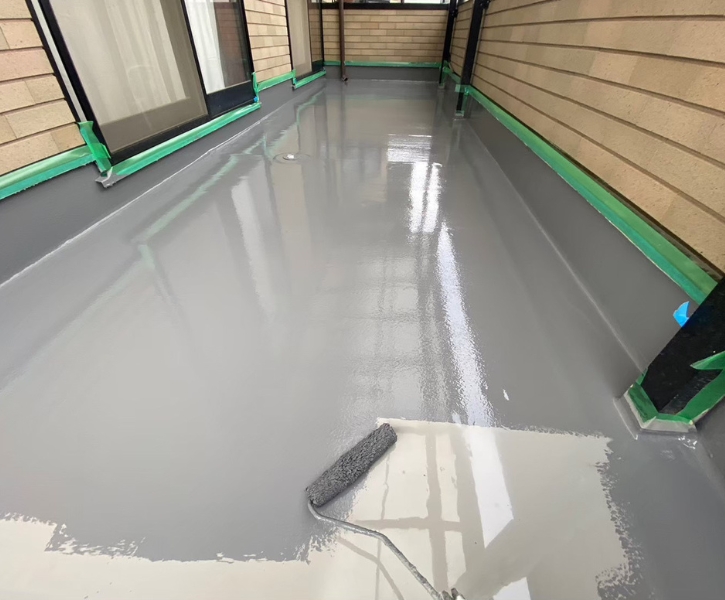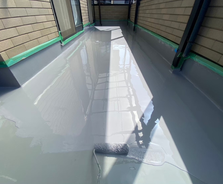 紫外線や雨風から防水層を守るため、最後にトップコート(保護塗料)を塗布します。トップコートには耐候性・防汚性があり、防水層の寿命を延ばします。グレーやグリーンなど、仕上げ色を選べるのも特徴です。