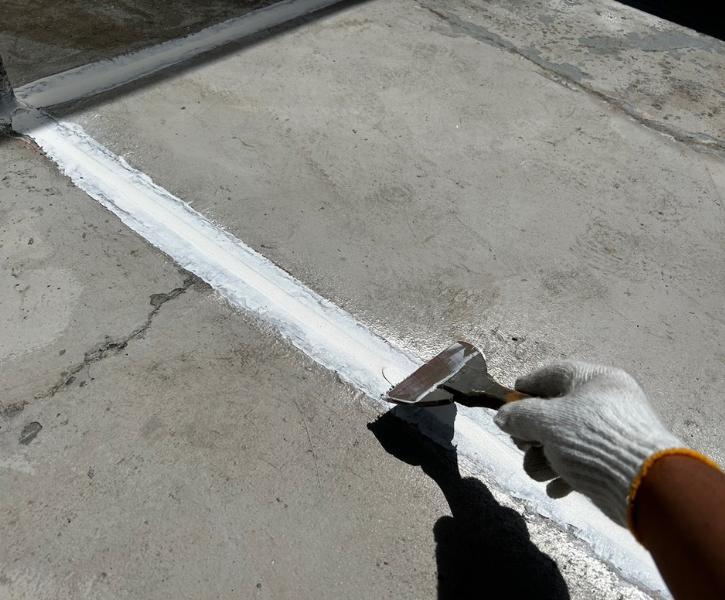 高圧洗浄やケレン(研磨)により、屋上表面の汚れ・苔・旧塗膜・埃を徹底的に除去します。下地が汚れていると防水層が密着せず、早期剥離の原因になるため非常に重要な工程です。また、ひび割れや欠損部がある場合は樹脂モルタルなどで補修します。