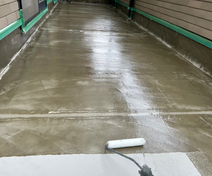 専用のウレタン樹脂をローラーやコテで均一に塗布します。1層目は防水層の基礎を形成する大切な工程で、厚みや均一性を丁寧に確認しながら施工します。