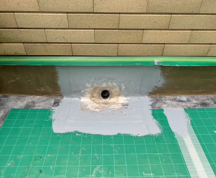 既存の排水ドレン部分は劣化やひび割れが発生しやすく、防水層の弱点となりがちです。そのため、防水工事では新たに改修ドレン(改修用排水口)を設置し、確実な排水経路を確保します。